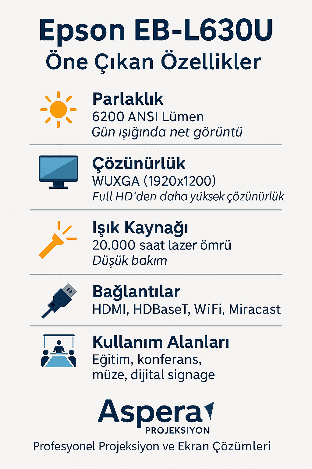 Epson EB-L630U, yüksek parlaklık ve WUXGA çözünürlük sunan lazer projeksiyon cihazı olarak eğitim kurumlarından kurumsal toplantılara, müze ve sergi alanlarından büyük ölçekli sunumlara kadar geniş bir kullanım alanı buluyor. Dayanıklı lazer ışık kaynağı, düşük bakım ihtiyacı, esnek kurulum seçenekleri ve fiyat avantajı ile öne çıkan EB-L630U, profesyonel kullanıcılar için güçlü bir çözüm sunuyor.