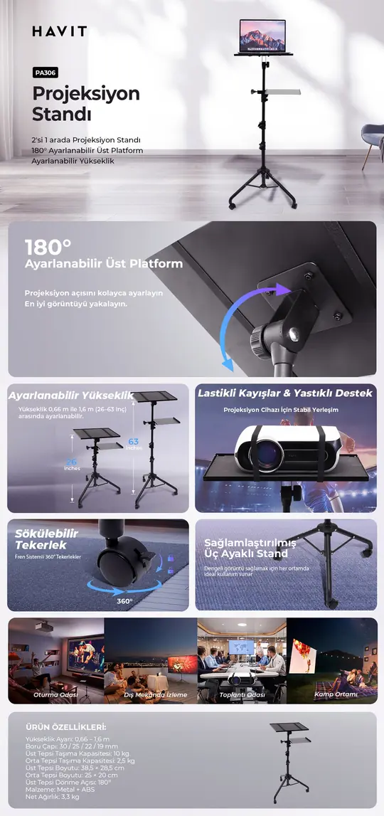 Havit PA306, eğitim kurumları, iş toplantıları ve ev sinema sistemleri gibi çeşitli alanlarda kullanılabilir. Projeksiyon cihazınızı en uygun açıda konumlandırarak, izleyici deneyimini en üst düzeye çıkarır.