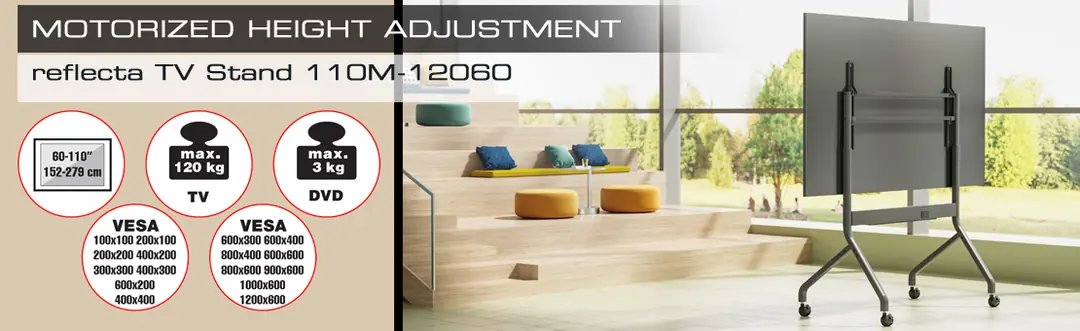 Reflecta, 110 inç'e kadar ekranlar ve 120 kg'a kadar ağırlıklar için 110M-12060 TV Standı ile mobil, sağlam ve yükseklik ayarlı bir stand sunar