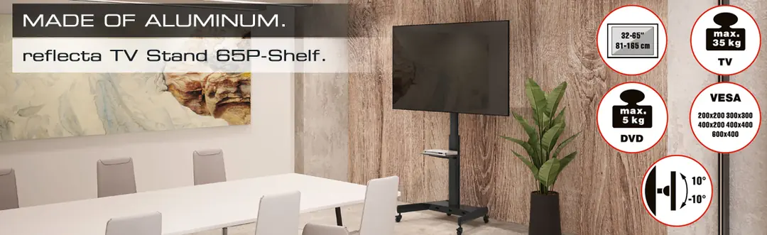 Reflecta’nın 65P-Shelf modeli, modern ve işlevsel bir mobil TV standı olarak tasarlanmıştır. Bu ürün, 32 inç ile 65 inç arasındaki düz ekran televizyonlar için uygundur ve maksimum 35 kg yük taşıma kapasitesine sahiptir. Alüminyum yapısı sayesinde hafif ve dayanıklıdır, bu da taşınabilirliğini artırır.