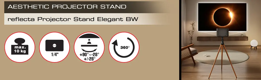 Reflecta "Projector Stand Elegant" sadece projeksiyonları doğru konuma getirmekle kalmaz, aynı zamanda atmosfer yaratan yaratıcı bir çerçeve sunar.