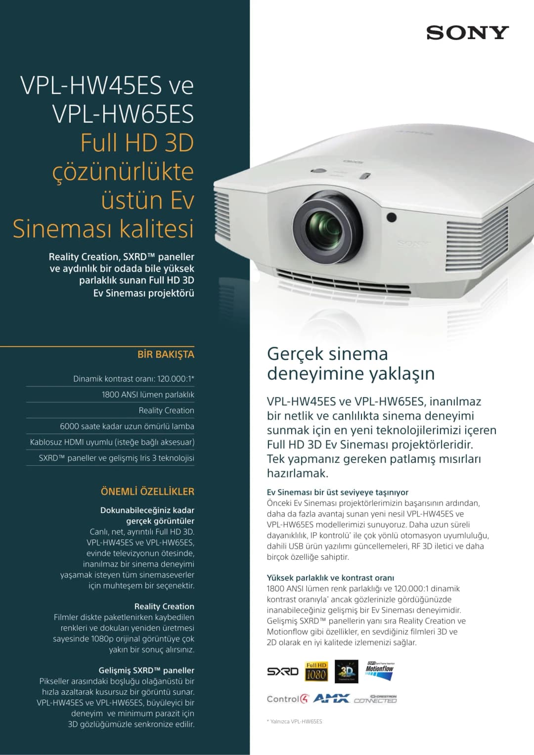 Sony VPL-HW45ES, Full HD 3D ev sineması kurulumları için tasarlanmış